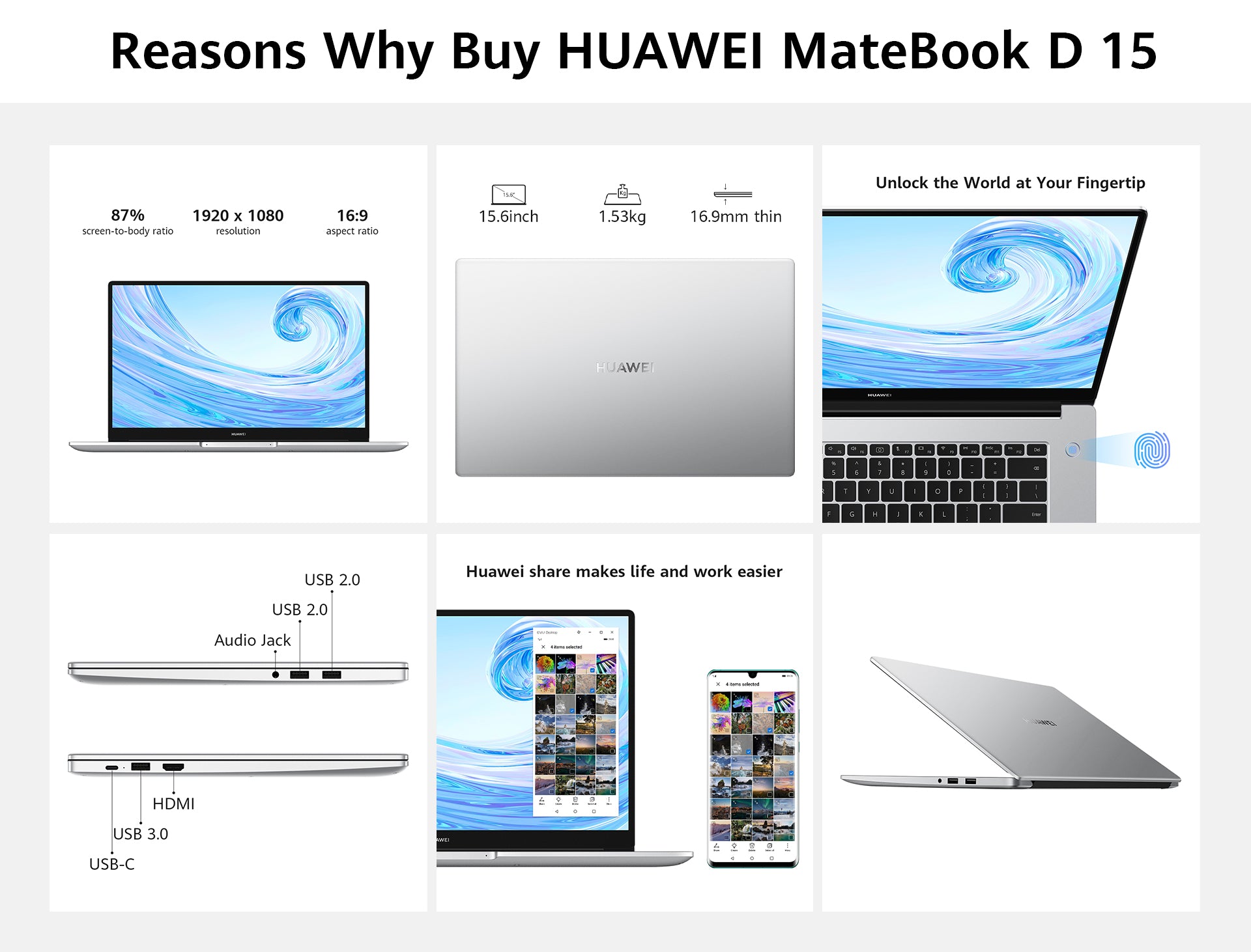 Vivid HUAWEI FullView Display: Enjoy stunning, immersive visuals on the 15.6-inch 1080p (1920 x 1080) FullView screen.2